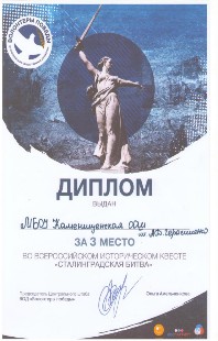 В районном Интернет-конкурсе "История в лицах", посвященном 70-летию победы в Великой Отечественной войне "Полководцы Великой Отечественной" Николаева Кристина - ученица 9 класса, заняла 2 место, а Легенчук Ксения - ученица 9 класса, заняла 3 место.
