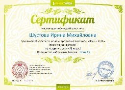 Назаров Илья - ученик 8 класса, занял 3 место в международной дистанцинной олимпиаде по истории России проекта "Инфоурок". Илья награжден дипломом победителя, а его учитель, А.Л.Ломакин, свидетельством и благодарностью