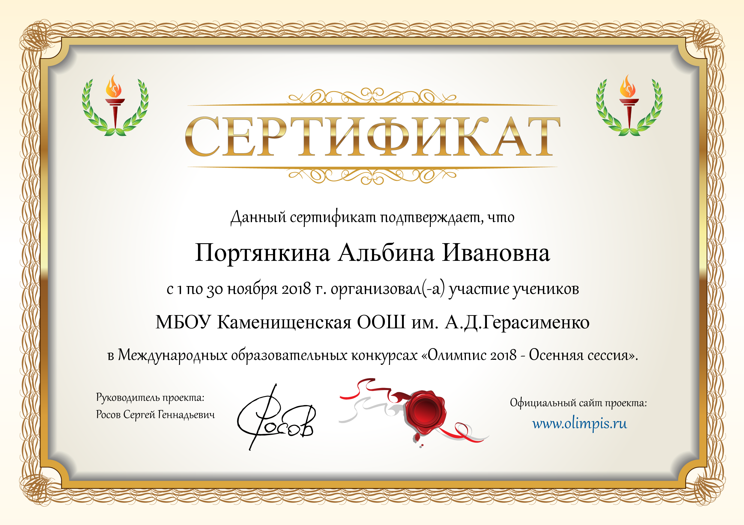 Завершился международный дистанционный образовательный конкурс «Олимпис 2018 – Осенняя сессия», в котором приняли участие восемь учеников нашей школы. Учителями – организаторами стали Хитина О.Е., Портянкина А.И., Назарова М.Л. Рассылка призов, дипломов, грамот начнётся с 15 февраля 2019 года.